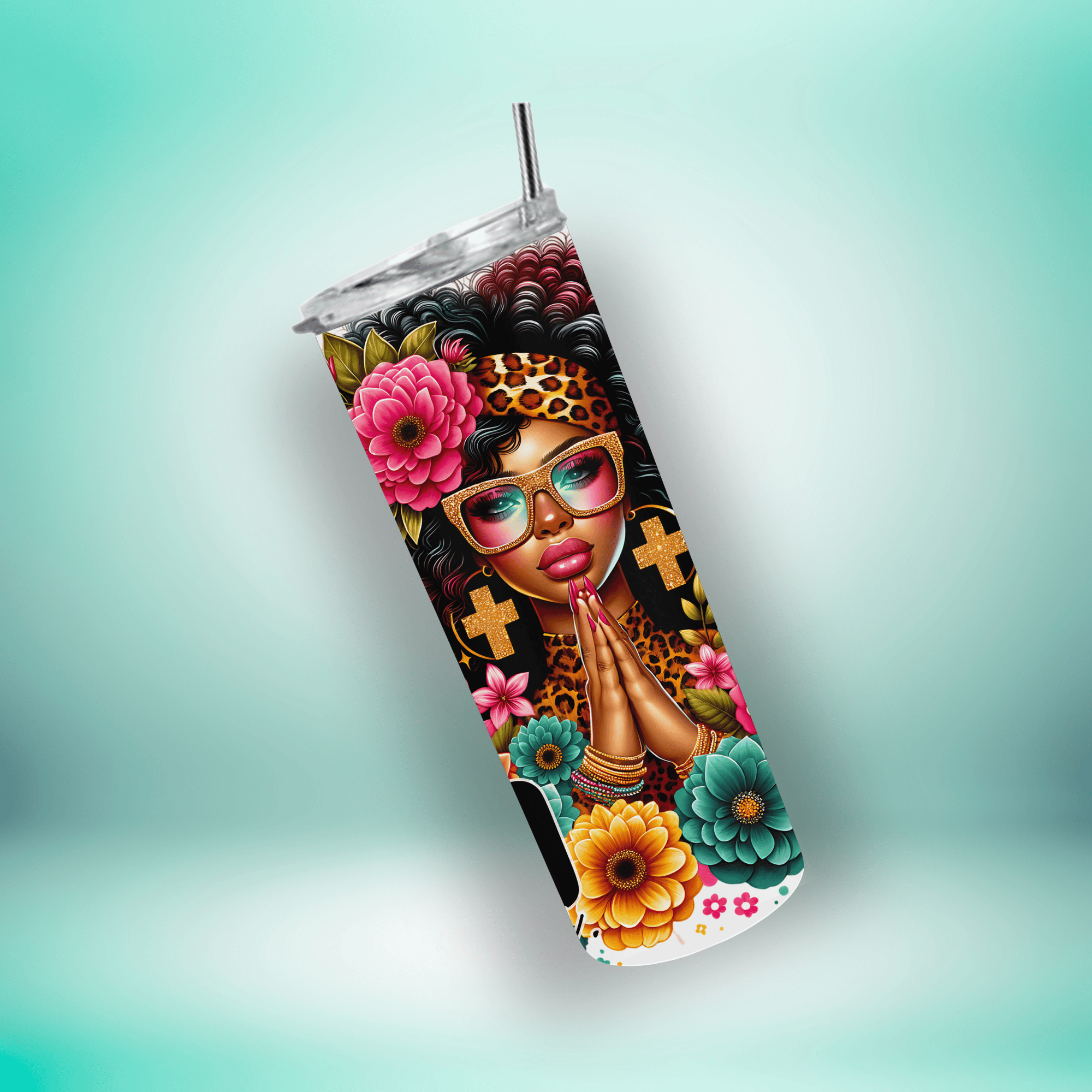 Bring peace and power to your day. This 20oz stainless steel tumbler features vibrant watercolor hues, flourishing blossoms, and a faith-filled illustration of a Black woman in prayer. Gold sunglasses, cross earrings, and leopard accents complete the soulful aesthetic.