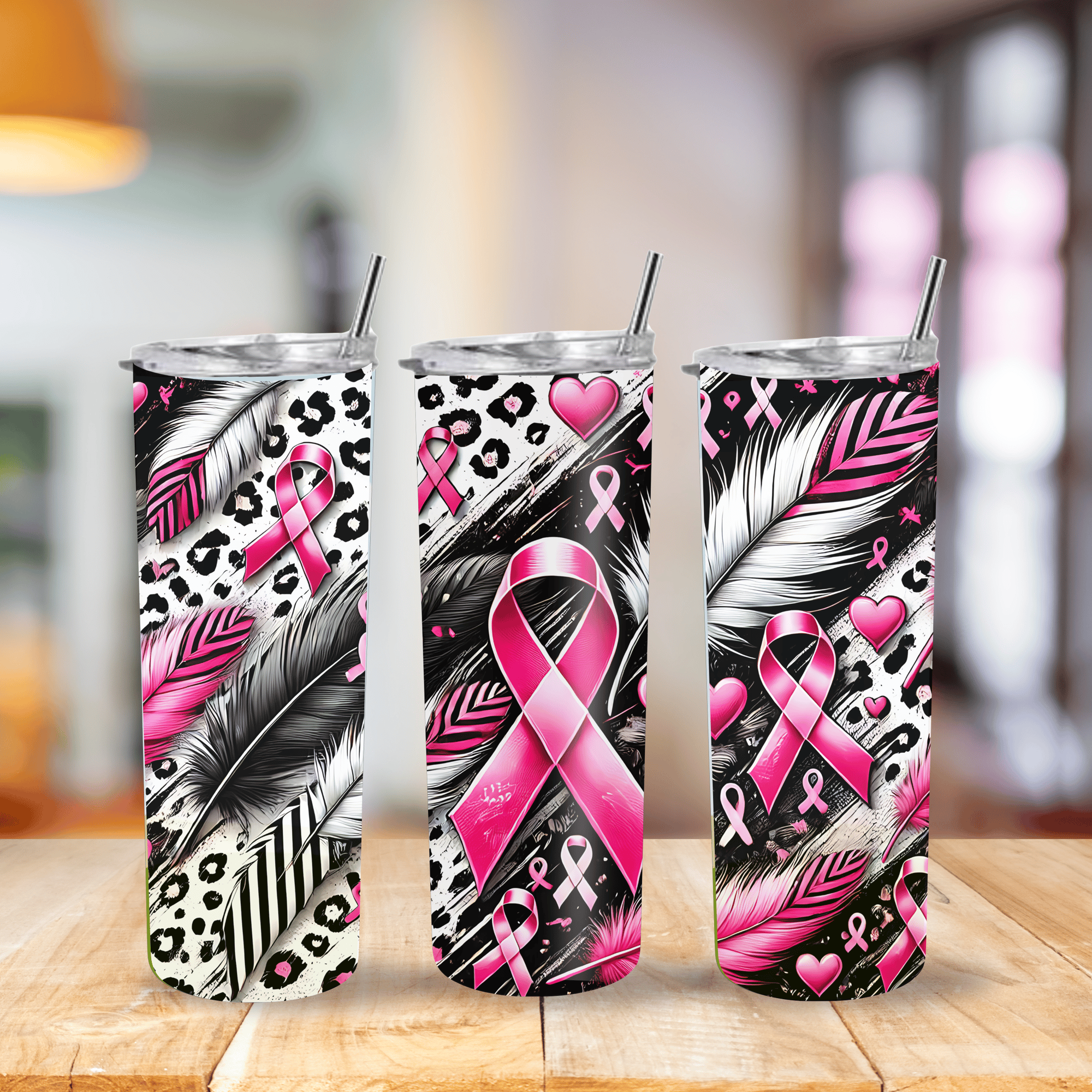 Sip with strength and style. This 20oz stainless steel tumbler features a striking collage of pink ribbons, animal prints, and feathered accents—designed to honor breast cancer warriors and survivors with unapologetic flair. From zebra stripes to leopard spots, every detail celebrates resilience, love, and bold self-expression.